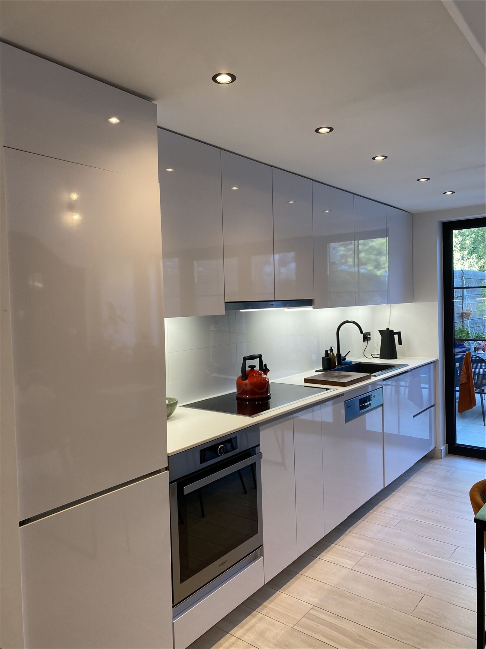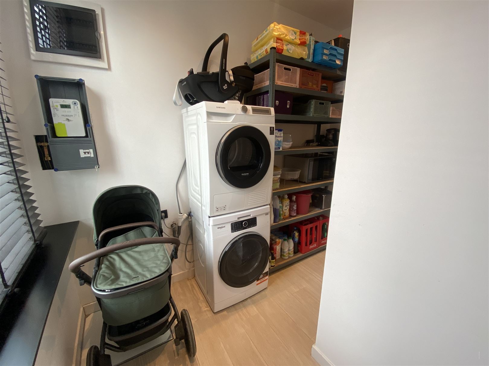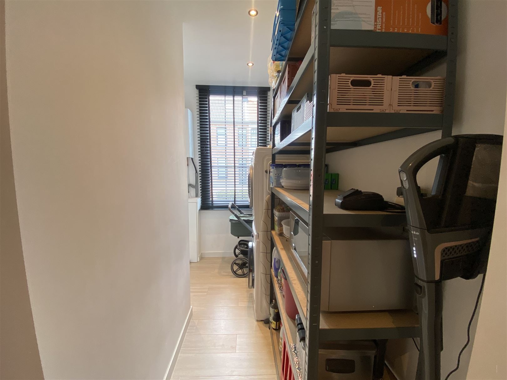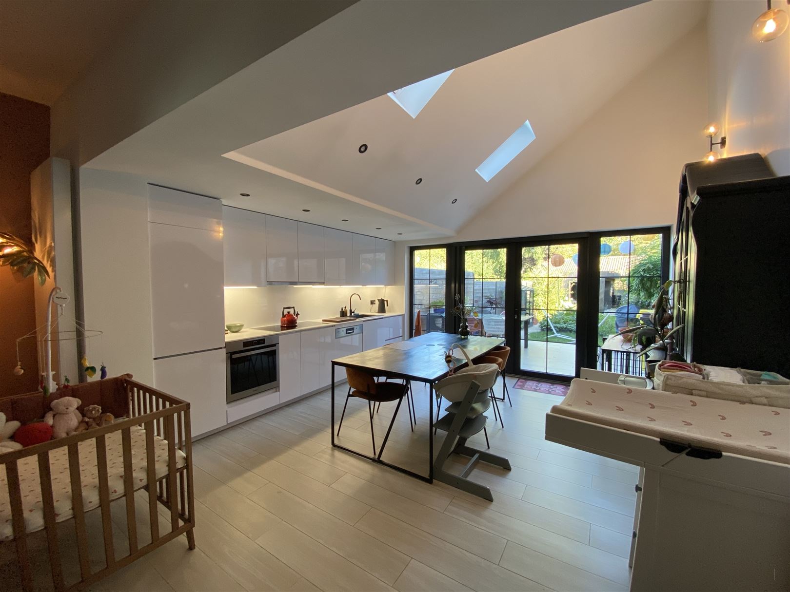 We betreden de woning via de inkomhal met apart gastentoilet. In de leefruimte met open keuken geniet u van veel lichtinval door de grote raampartijen aan de achtergevel en de dakramen. De hoge plafonds zorgen voor een ruim gevoel. De open keuken werd mooi geïntegreerd in het geheel en is voorzien van kwalitatieve toestellen. Vanuit de keuken kan u genieten van de gezellige tuin met zicht op groen. Op het gelijkvloers bevindt zich verder nog een aparte berging/wasplaats met toegang vanuit de hal en de woonkamer. Ideaal om een fiets of kinderwagen in op te bergen.